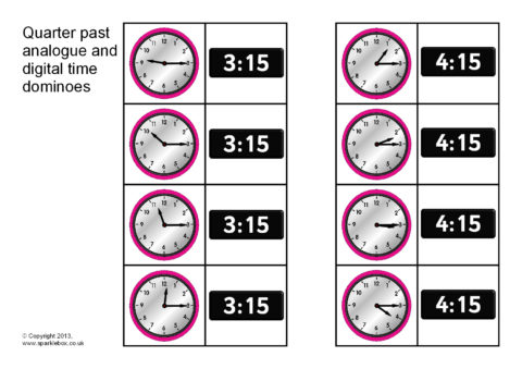 A printable domino set that features analogue and digital quarter past times. Players can match both analogue and digital times together. Great for helping children to recognise the same times written in both analogue and digital formats.
