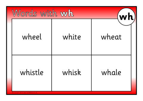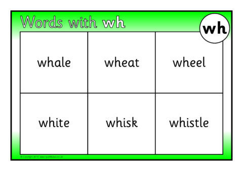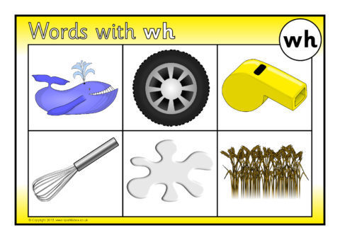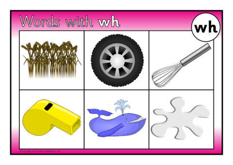 Printable bingo boards and picture cards where children match the pictures to the words featuring the initial sound ‘wh’.