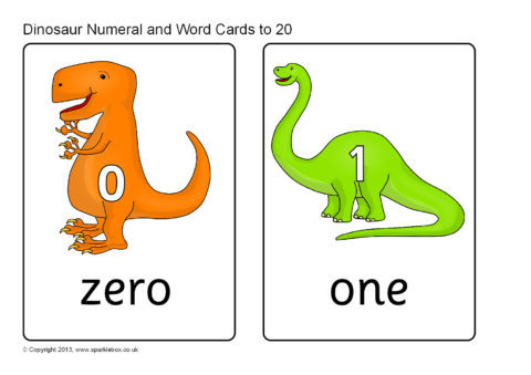 A set of flash cards with numerals and words from zero to twenty. Featuring fun cartoon dinosaur characters.