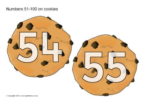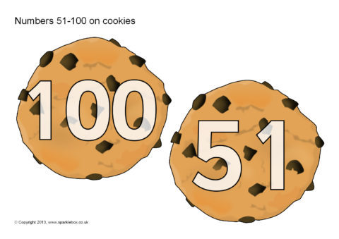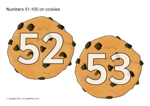 The numbers 51 to 100 presented on chocolate-chip cookies/biscuits. An extension to our Numbers 0-50 on cookies resource.