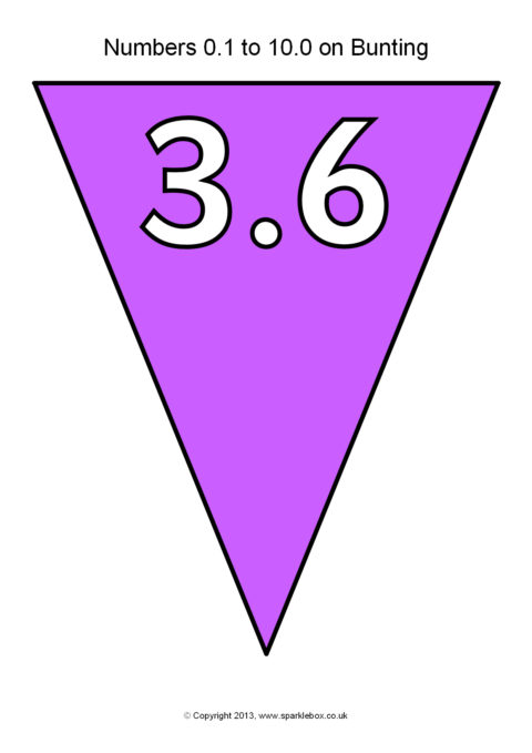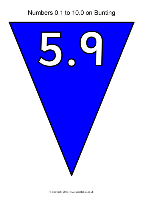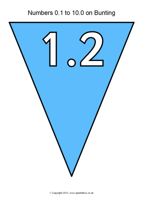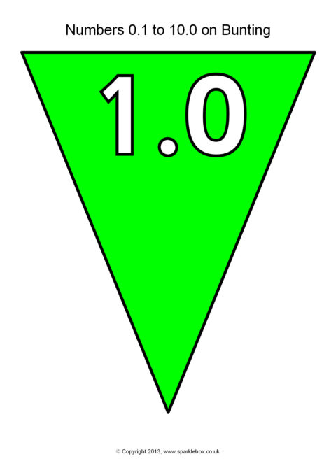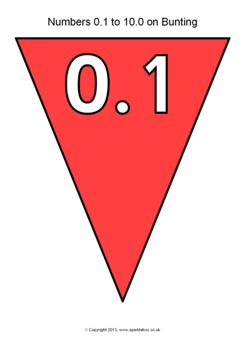The decimal numbers from 0.1 to 10.0 presented on printable multi-coloured bunting.