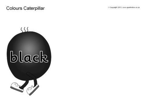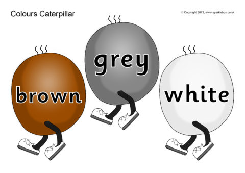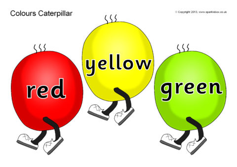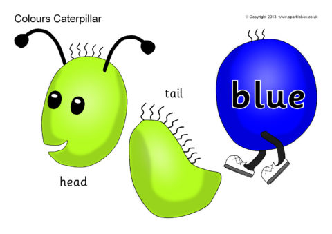 Create a large caterpillar with different coloured segments each labelled with the corresponding colour word.