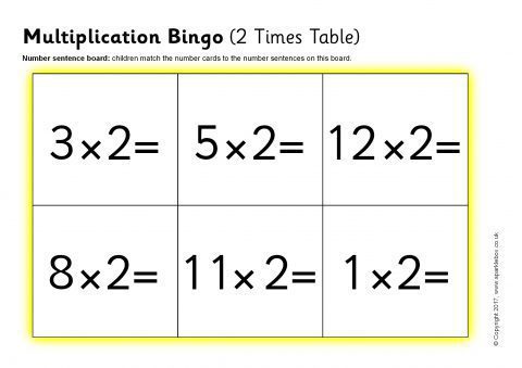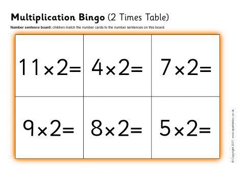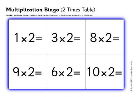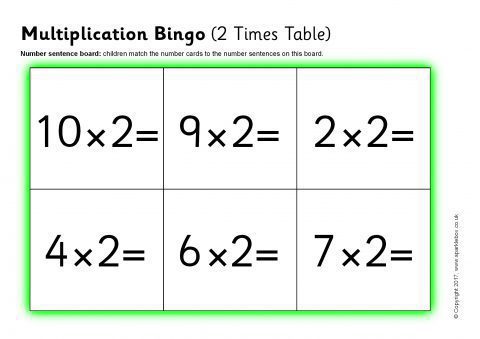 A set of printable bingo boards and number cards with multiplication number sentences from the 2 times table.