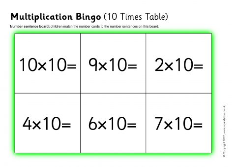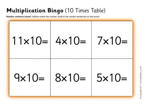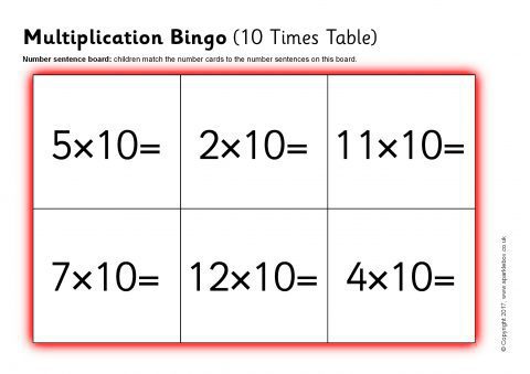 A set of printable bingo boards and number cards with multiplication number sentences from the 10 times table.