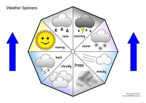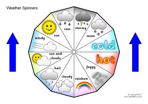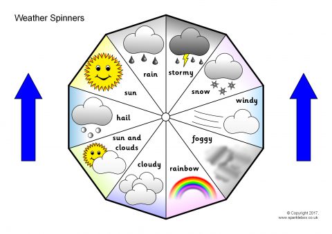 Printable weather spinners for use on your classroom weather or calendar display. Print out on card and cut out the arrows and spinner, laminate and use to display the current weather.