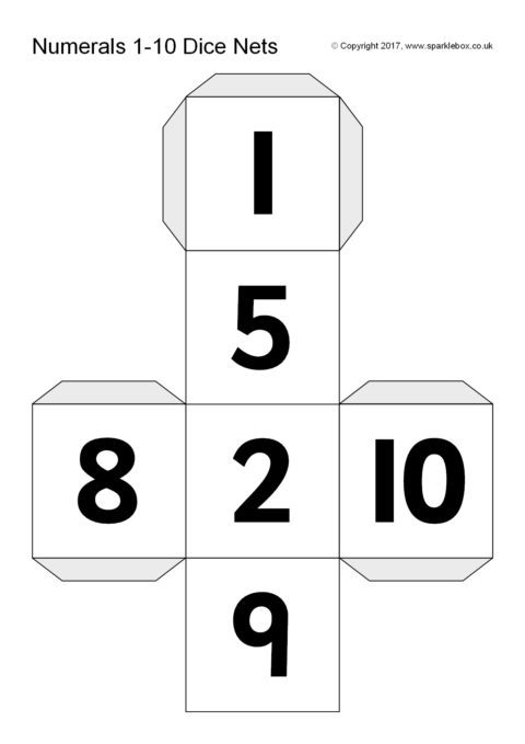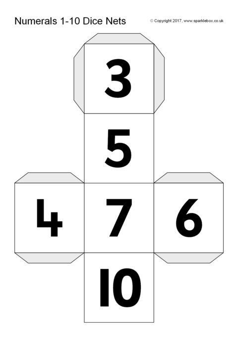 Basic printable dice nets featuring the numbers from 1 to 10.