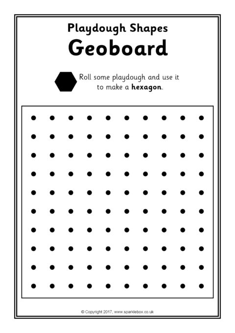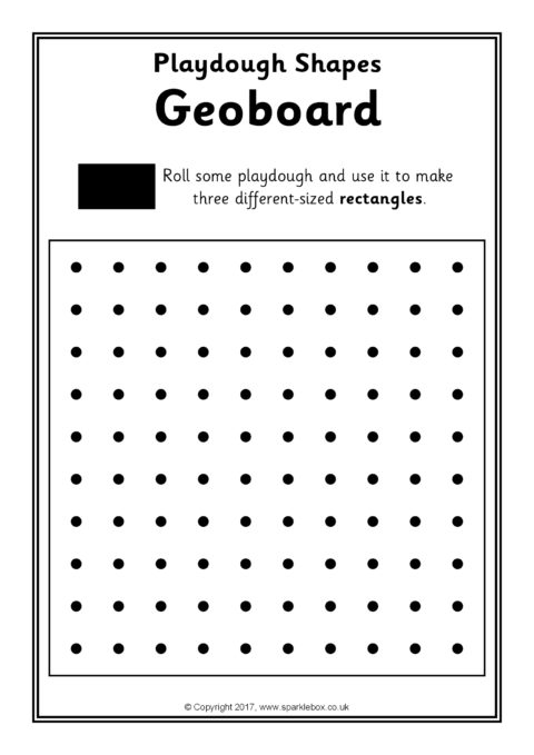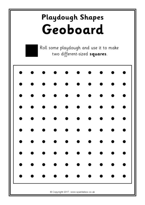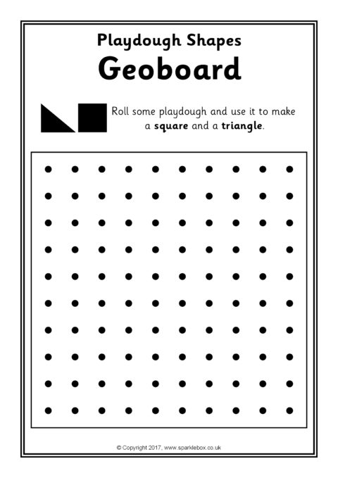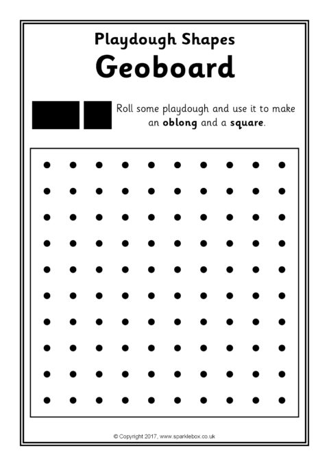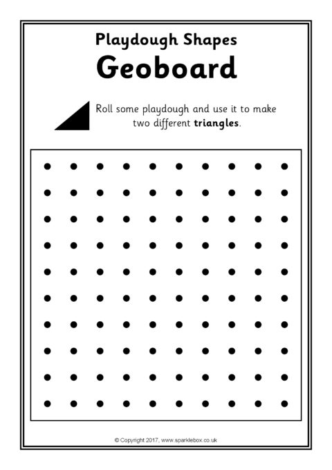 Print out and laminate for use with playdough. Children are challenged to make basic 2D shape outlines overlaying rolled out playdough onto the geoboard grids.