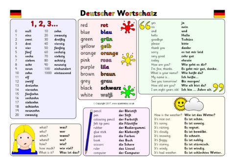 A printable desk mat that features lots of simple and useful words and phrases in German and English.