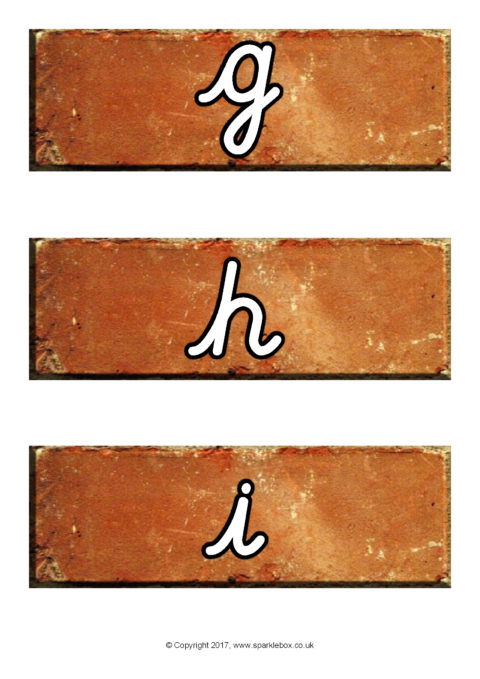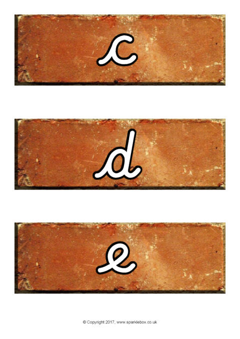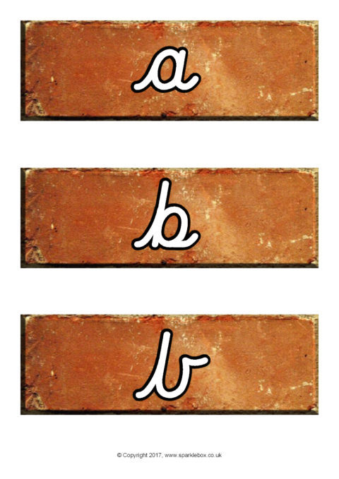 The lowercase alphabet letters presented in cursive script on authentic-looking bricks. Use for 'word building' activities where children construct words using the bricks or make a classroom 'alphabet wall' display.