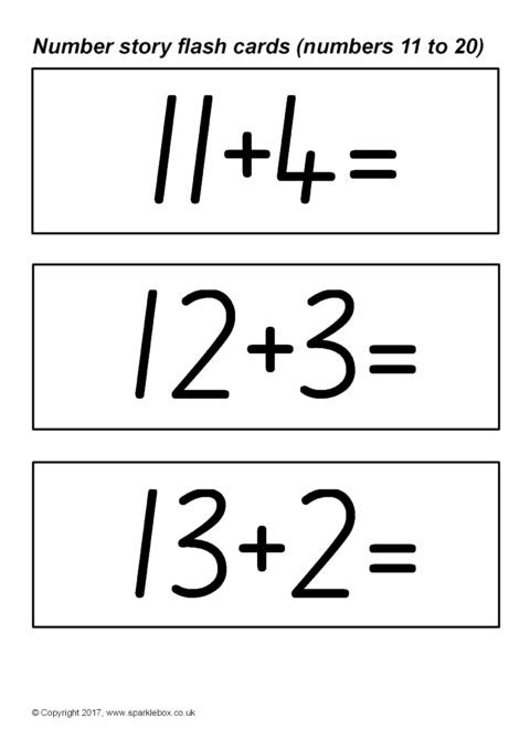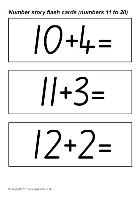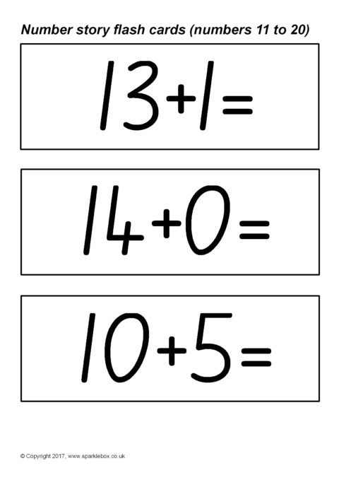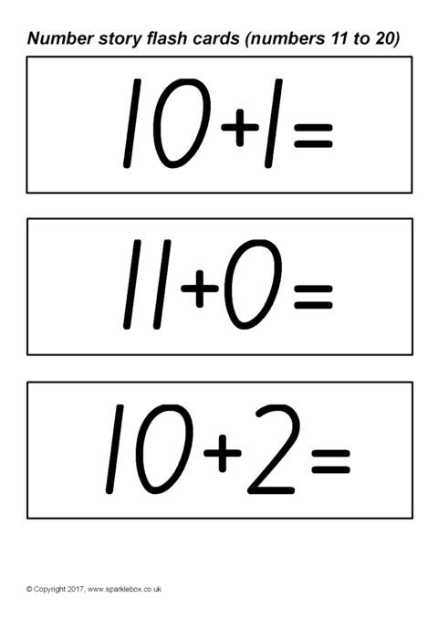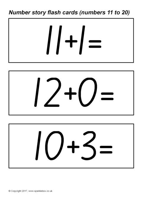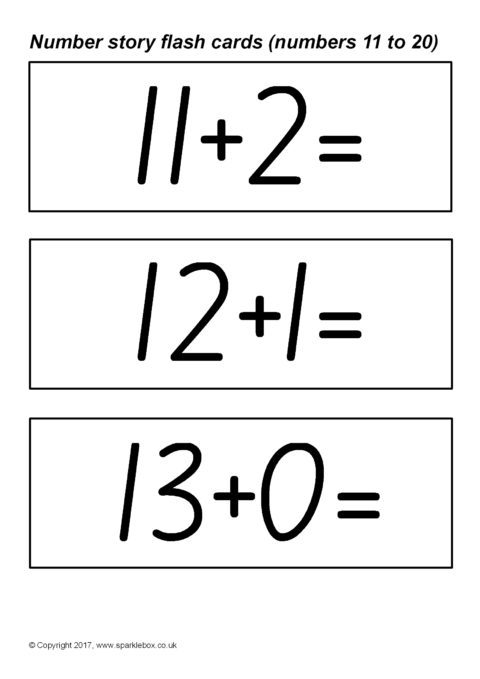 Simple flash cards showing number sentences for making numbers 11 to 20. An extension of our Number story flash cards (1 to 10) resource.