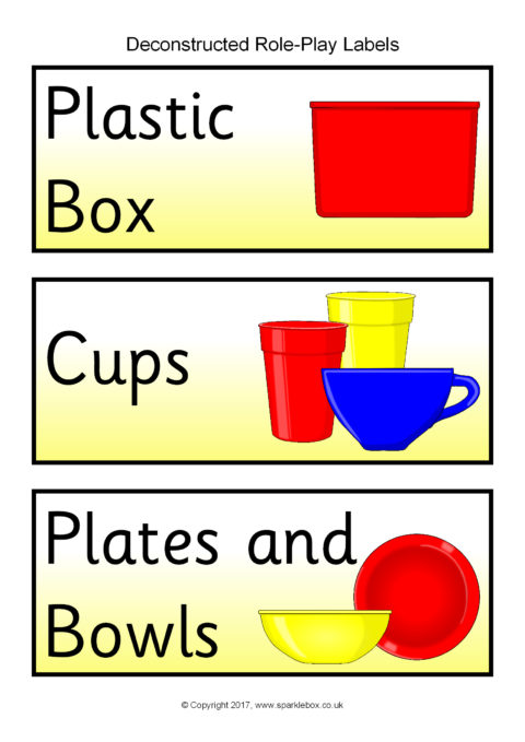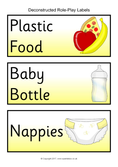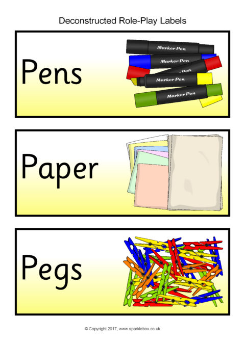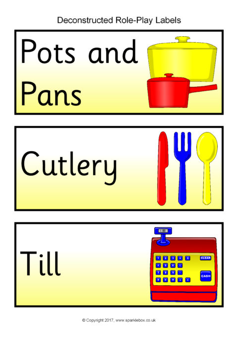 A set of printable word and picture labels for the resources in your classroom deconstructed role-play area.