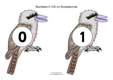 The numbers from 0 to 100 presented on cartoon kookaburras. Ideal for a classroom number track, sorting activities and flash cards.