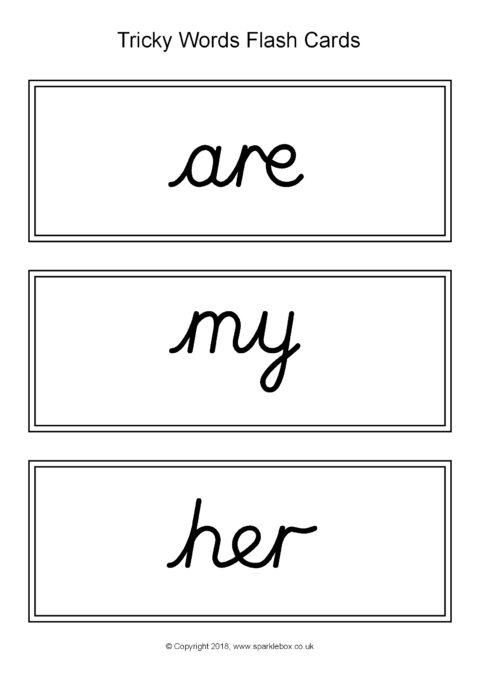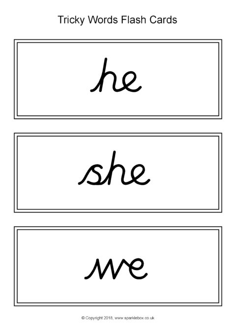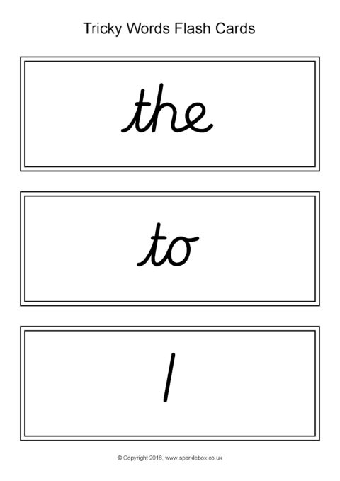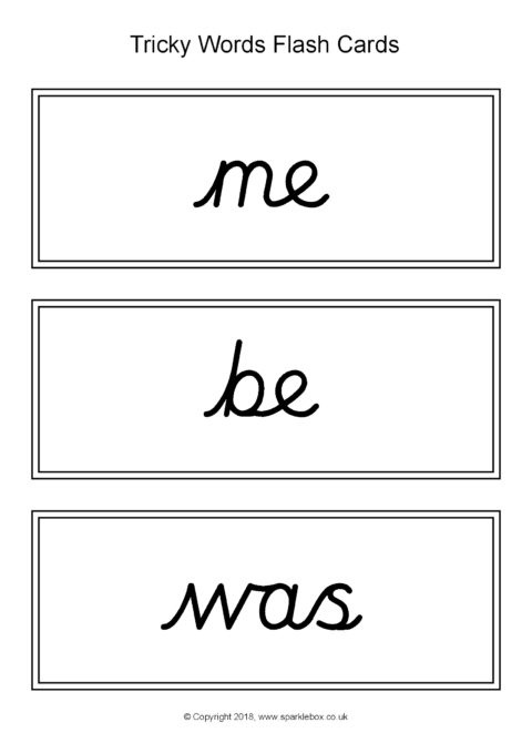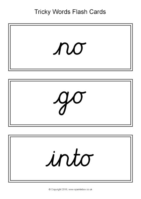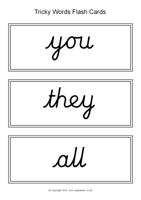 The tricky words (as specified in the DfES ‘Letters and Sounds’ publication) in cursive script, presented on flash cards, 3 to a page.