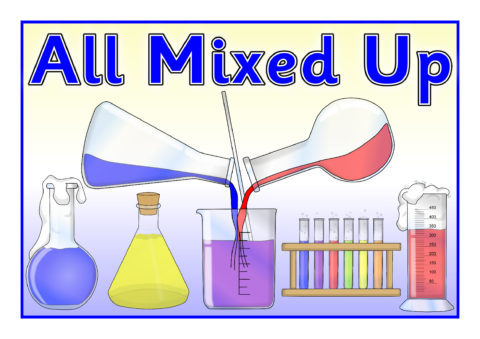 A poster heading for your classroom display about mixing chemicals, with the title 'All Mixed Up' and colourful pictures of various chemical jars.