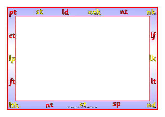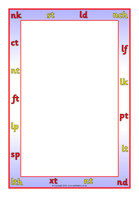 Portrait and landscape A4 page borders featuring final consonant blends. Includes editable Microsoft Word templates as well as resizable JPG images.
