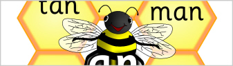 A set of visual aids featuring 2-letter rimes and example words presented on honeycomb alongside a cartoon bee character.
