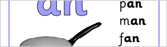 A printable desktop mat showing various rime chunks with pictures to accompany Progress In Learning 1 by Kim Morris.