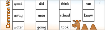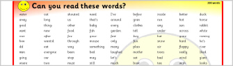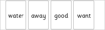 The next 200 common words as specified in the DfES ‘Letters and Sounds’ publication presented on simple flash cards.