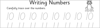 A set of basic worksheets where pupils trace and write numerals from 10 to 20.