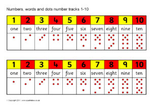 Numbers, Words and Dots Number Tracks 1-10 (SB05980) Colourful number tracks featuring numbers and words with dots from 1 to 10.