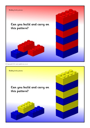 A set of prompt cards where children can make and continue the repeating patterns using building bricks. Includes black and white versions to colour yourself as appropriate.