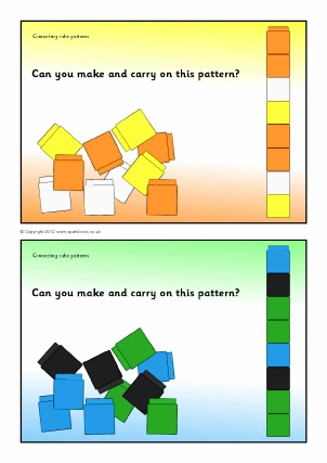 A set of prompt cards where children can make and continue the repeating patterns using connecting cubes. Includes black and white versions to colour yourself as appropriate. Ideal for use with Unifix® cubes.