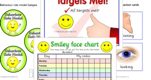 Two printable 5-day reward charts for children to stick on stars or draw smiley faces.