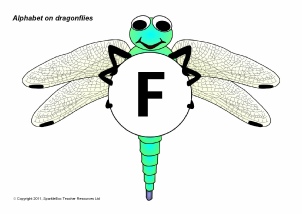 The uppercase alphabet letters presented on fun dragonfly characters.