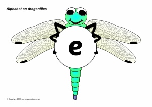 The lowercase alphabet letters presented on fun dragonfly characters.