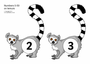 A set of printable lemur characters featuring the numerals from 0 to 50.