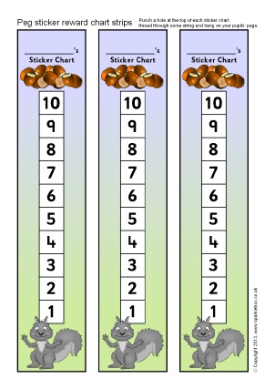 A set of printable sticker reward chart strips that you can print, laminate and hang from pupil’s pegs. Each includes a colourful fun design and space for 10 small stickers.