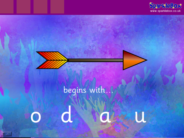 An interactive PowerPoint activity where children are presented with objects beginning with ‘a’ and they must identify the correct letter ‘a’.