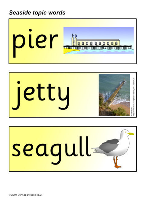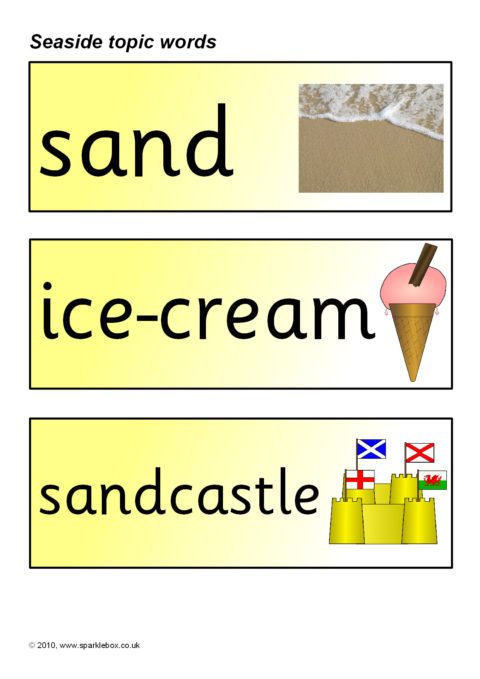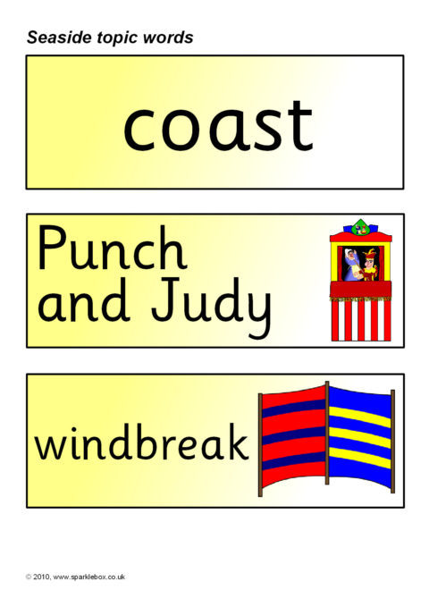 A set of word and picture cards linked to a topic on the seaside. Great for classroom displays, word banks or laminating for other topic-related activities.