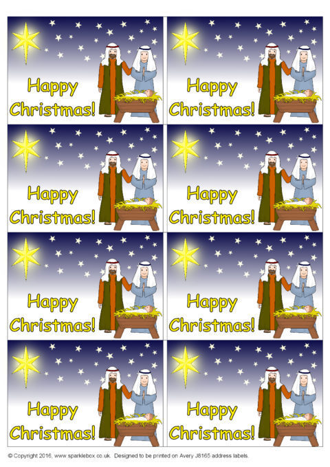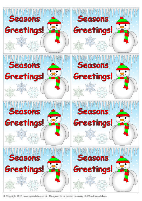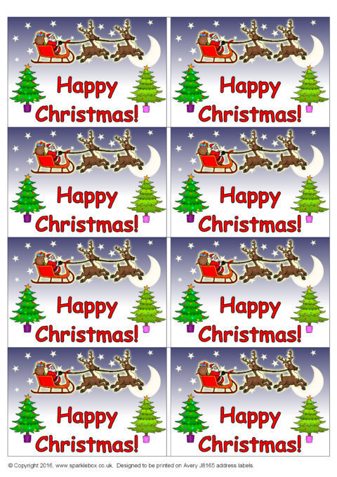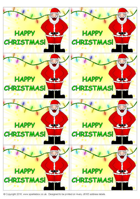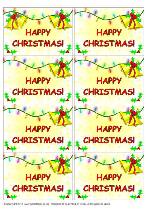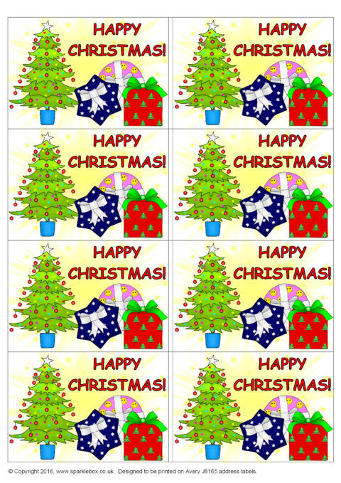 A set of gift tag sticker templates with a Christmas theme (8 stickers per A4 page) designed to be printed on Avery Labels J8165.