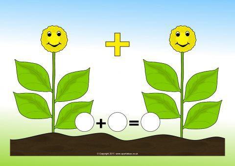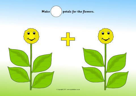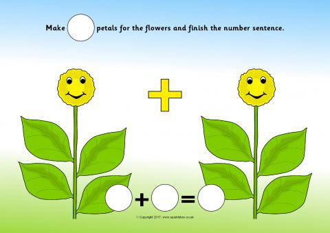 Print this out and laminate for use with playdough. Children make petals for the two flowers and finish the addition number sentence.