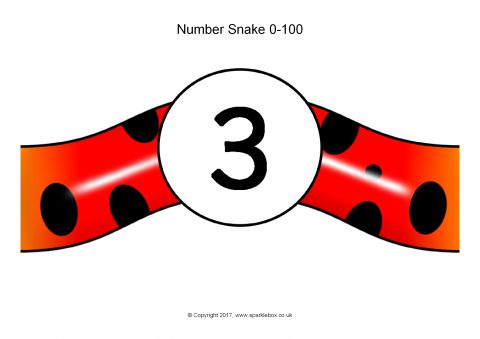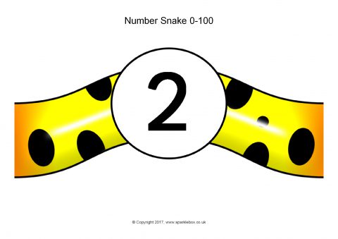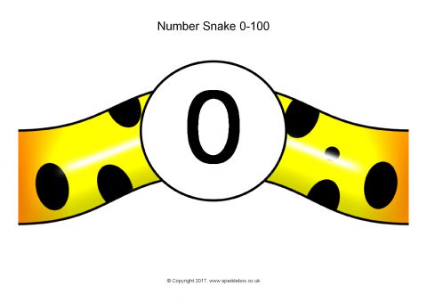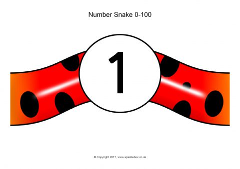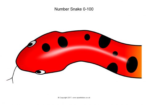 A large printable red and yellow snake number track with the numbers from 0 to 100.