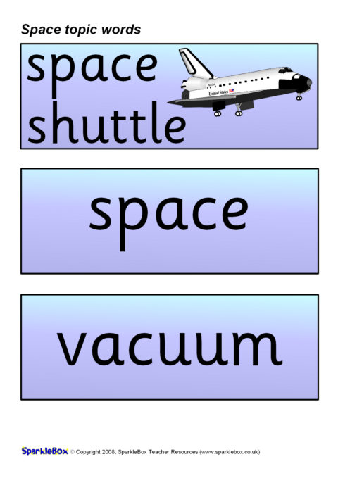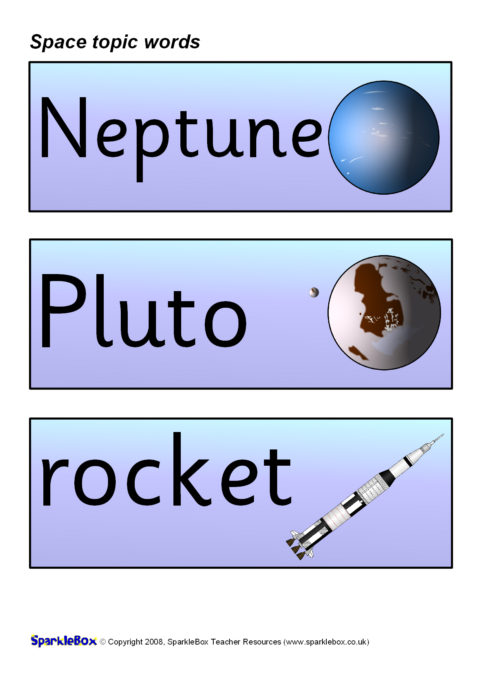 A set of printable word and picture cards featuring key words linked to a topic on space. Includes the names of all 8 Solar System planets.