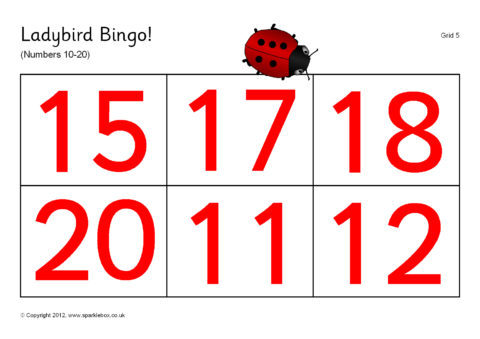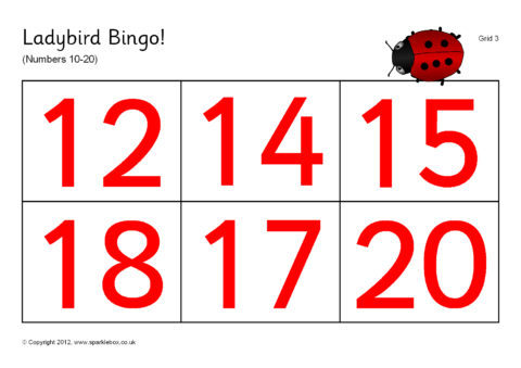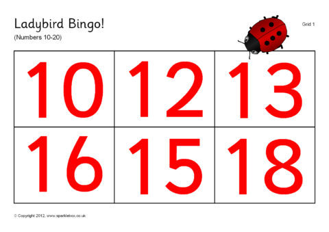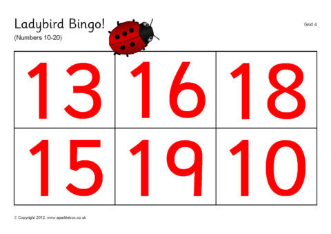 A bingo game designed to help with counting and recognition of numbers 10-20. Includes 6 printable bingo boards and a set of ladybird cards where each ladybird has a different number of spots (10-20).