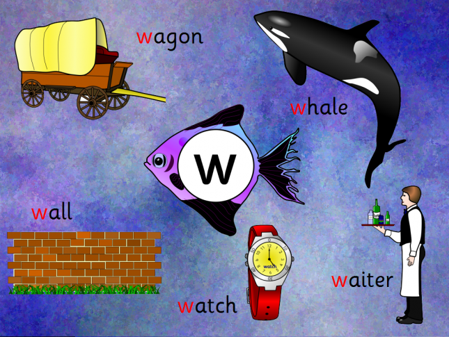 A teacher-controlled presentation for use with the whole-class or smaller groups. As the mouse is clicked, objects beginning with ‘w’ appear along with the accompanying words.