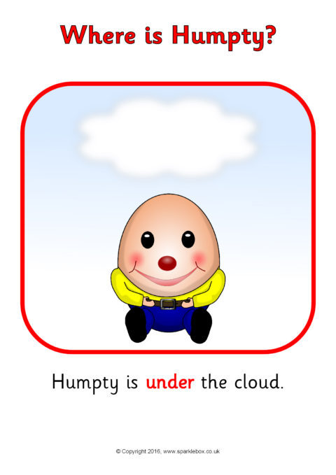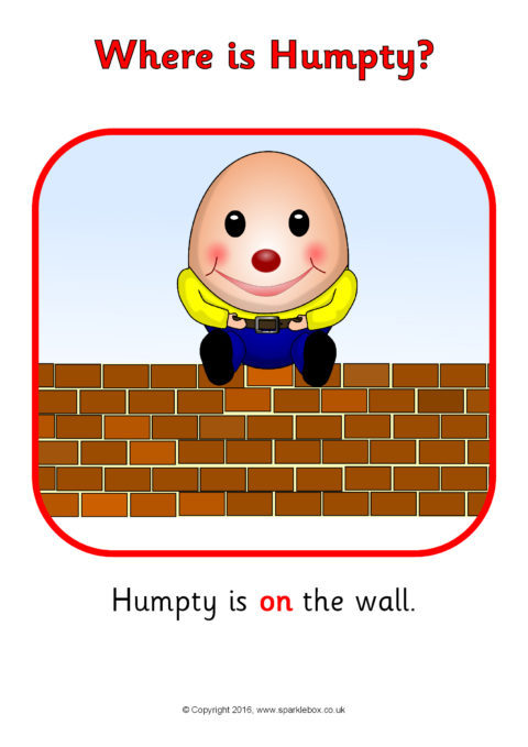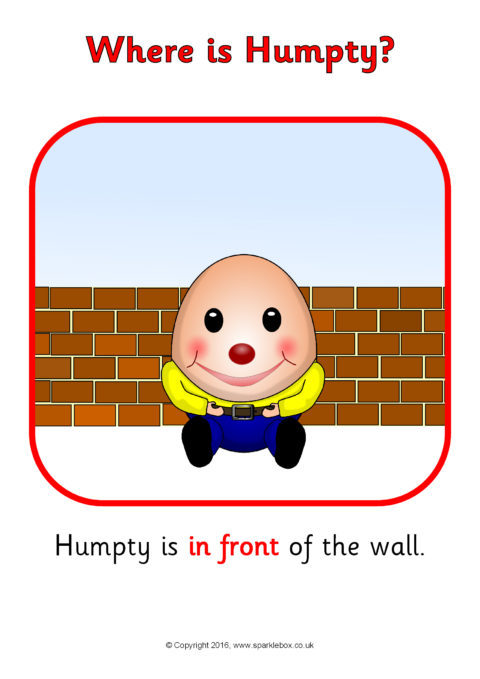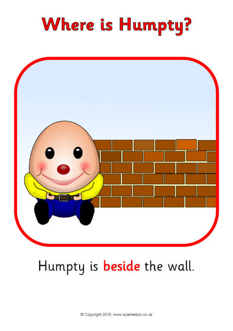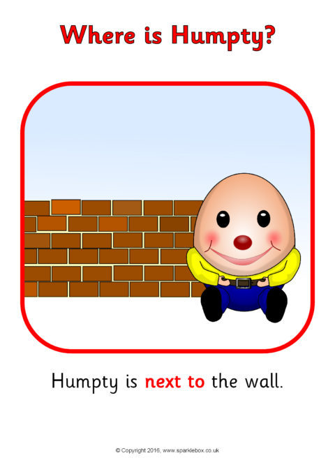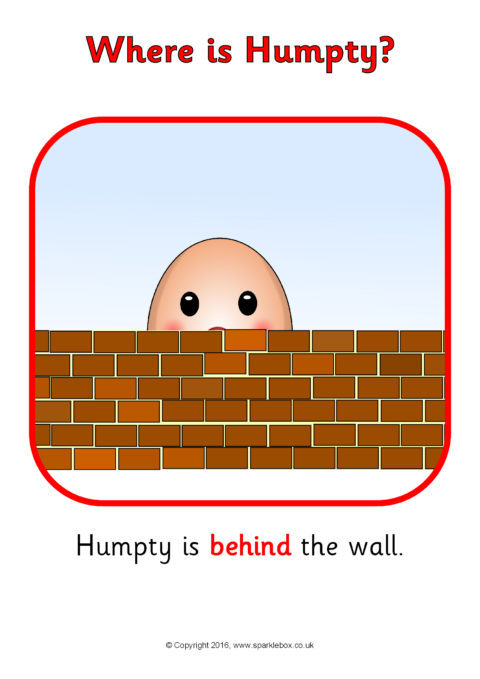 A set of fun visual aids where children can be asked the position of Humpty Dumpty in relation to the wall.