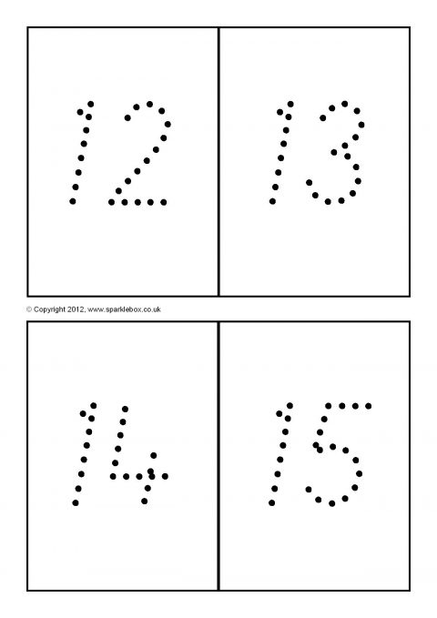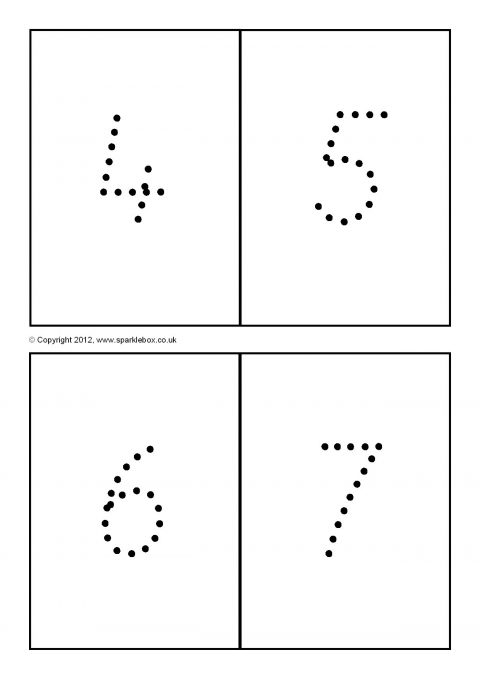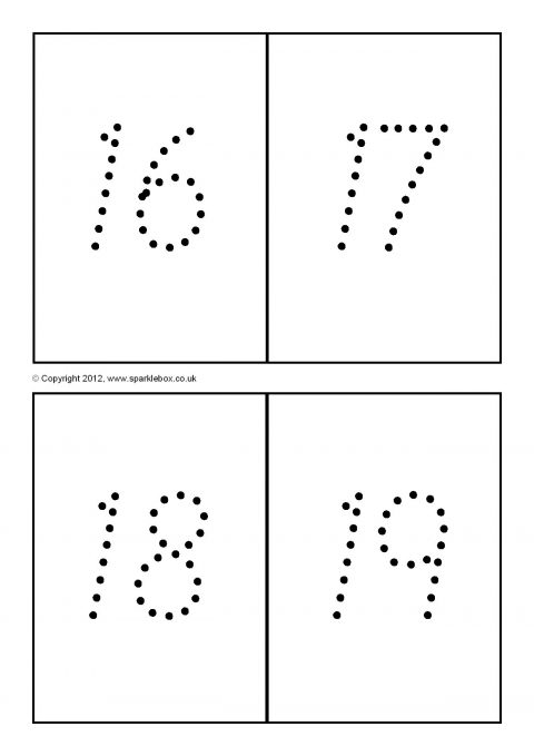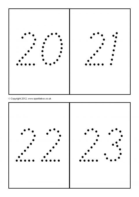 The numbers 0 to 100 on printable cards, four to a page, in a ‘dotty’ format.