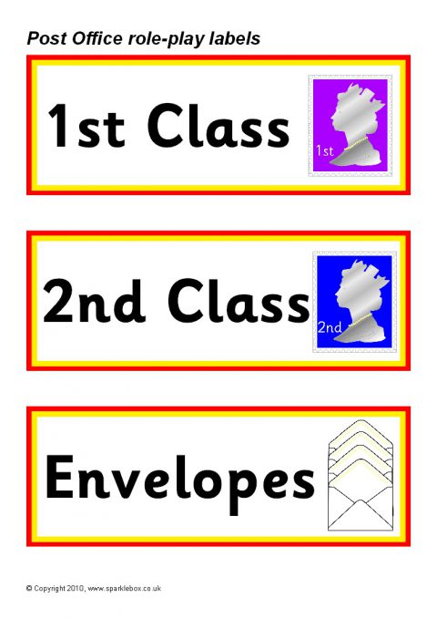 A set of useful printable signs and labels for use in your Post Office role-play area. Includes A4 posters, a ‘Post Office’ banner, labels, signs as well as writing aids for special deliveries, address labels etc.