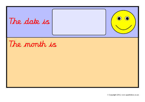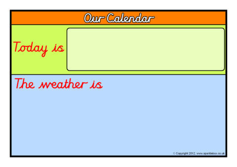 A printable daily calendar for displaying in the classroom. Laminate the different elements and each day you can blue-tack on the day’s name and appropriate weather symbol. Also includes months and dates.