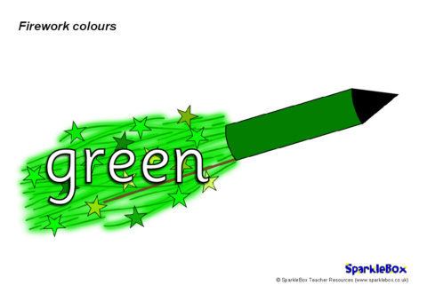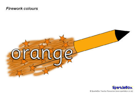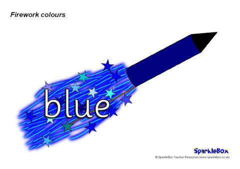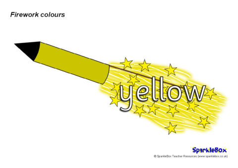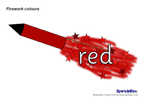 8 A4 printable sheets with different coloured firework rockets and colour-words.