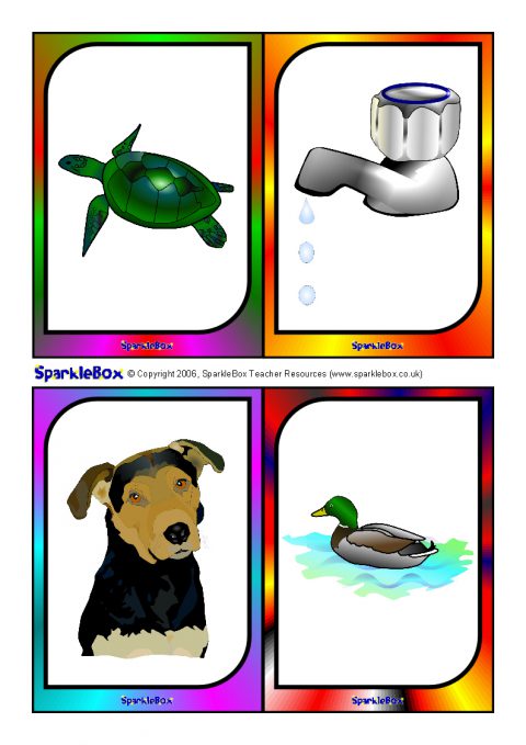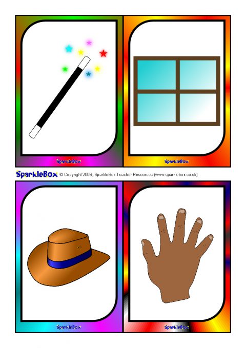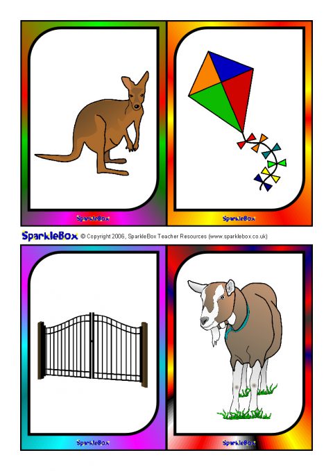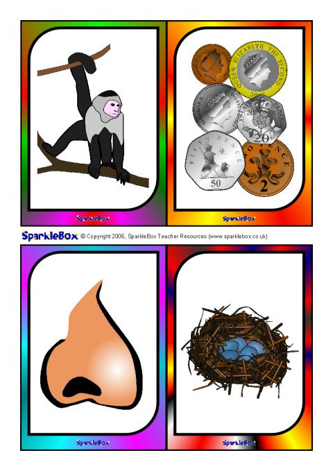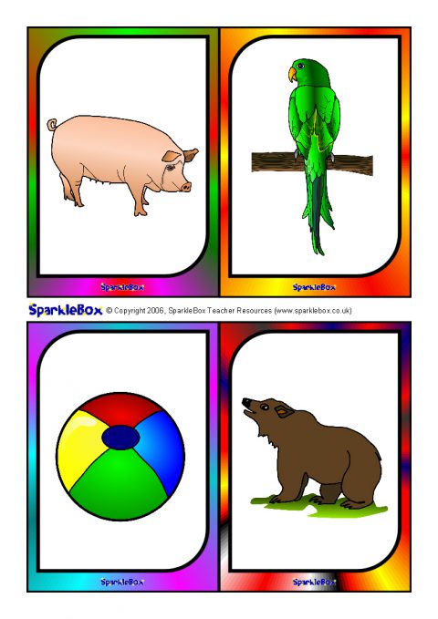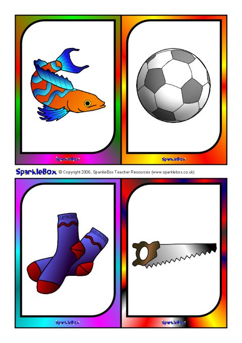 A useful set of brightly-coloured printable picture cards (4-to-a-page) for use with children to help and assess children with language and speech difficulties. Hold up a picture card and ask the child to say what they see. There are two pictures for each of the key speech sounds: p, b, m, n, t, d, w, h, k, g, f, s, l, y, ch, sh, v, z, j, th and r.