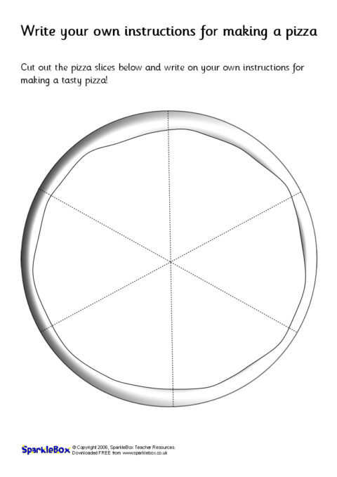 A set of 4 sheets (each slightly different to suit your needs) with a pizza template where children can write their own instructions on each pizza slice.