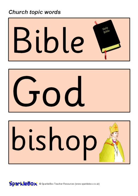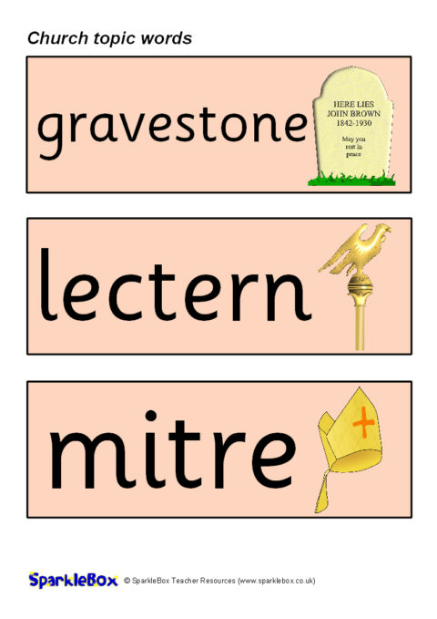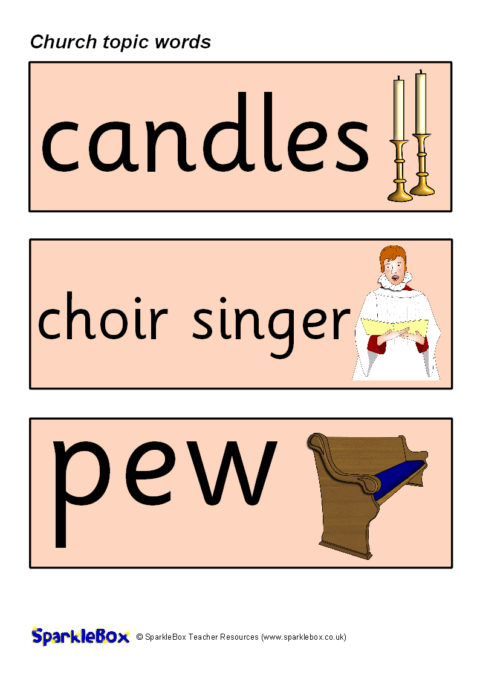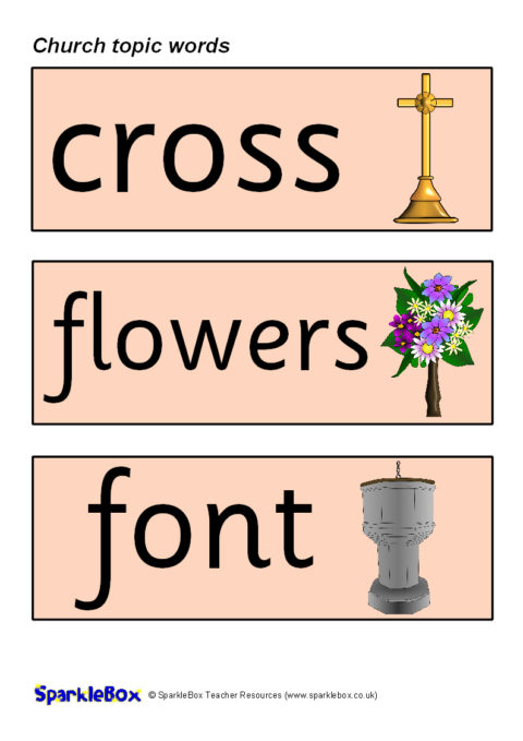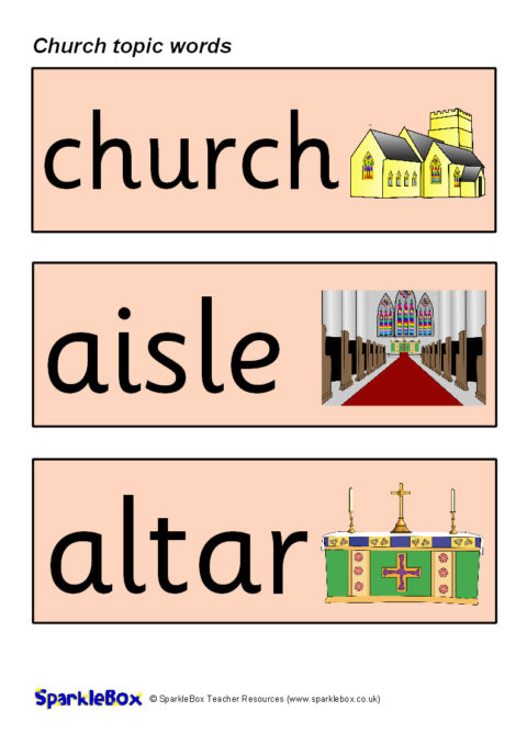 A printable set of words with accompanying pictures related to a traditional Christian church. These are great for use as aids when children are writing, or for a classroom topic display.
