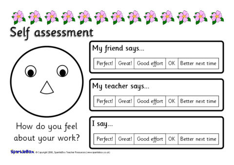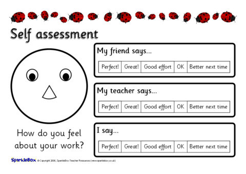 5 printable A4 sheets to help children self-assess their own work. Each includes space for a friend and the teacher to feedback as well as a face they can complete to show how they feel about their work.