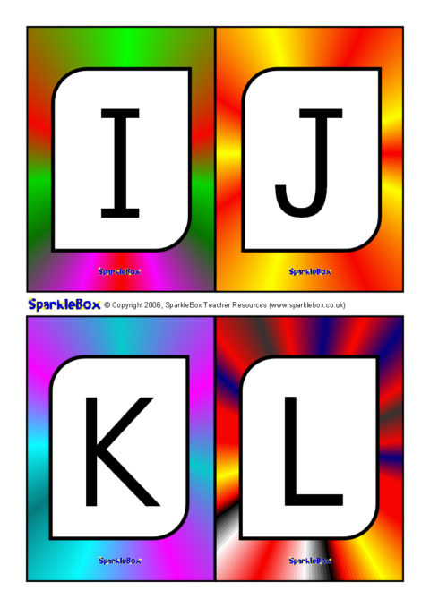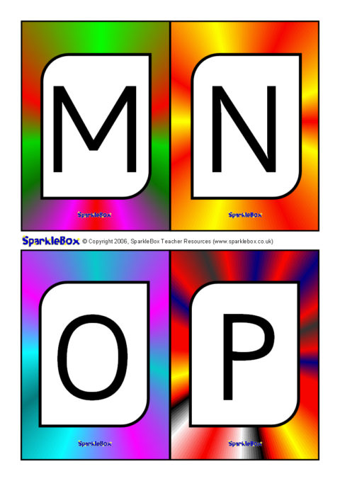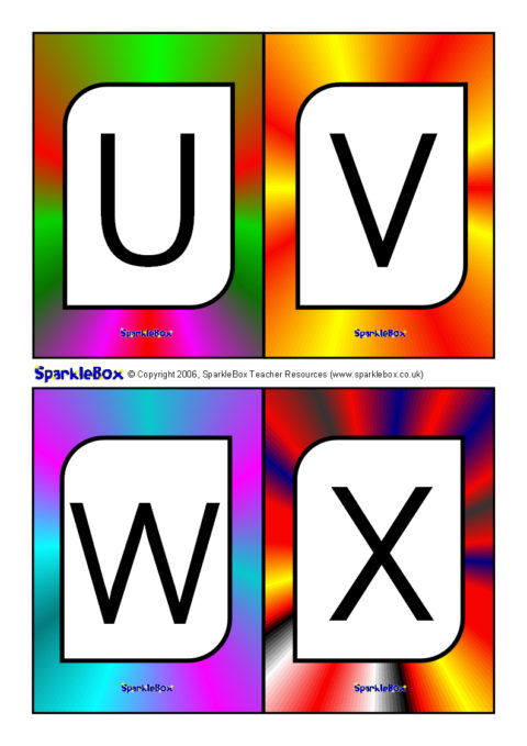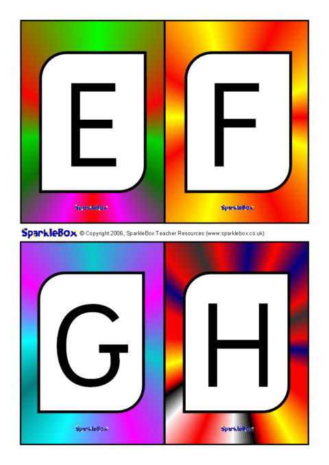 A useful set of brightly-coloured printable cards (4-to-a-page) which show all 26 alphabet sounds in uppercase.