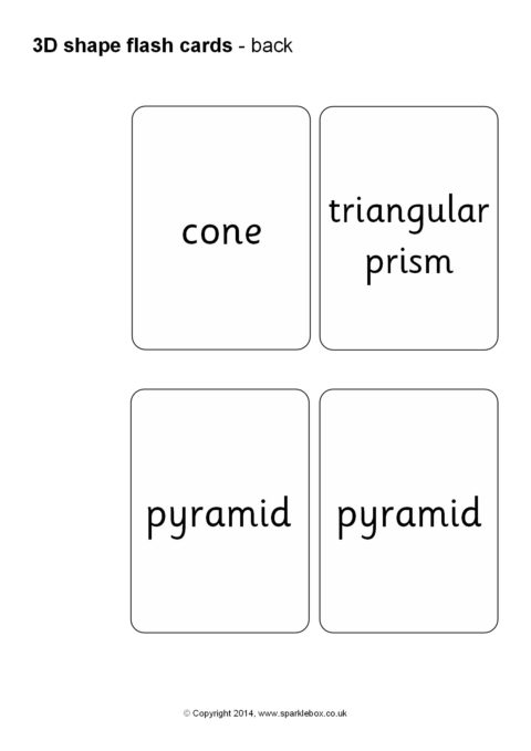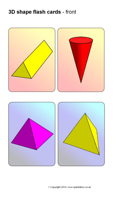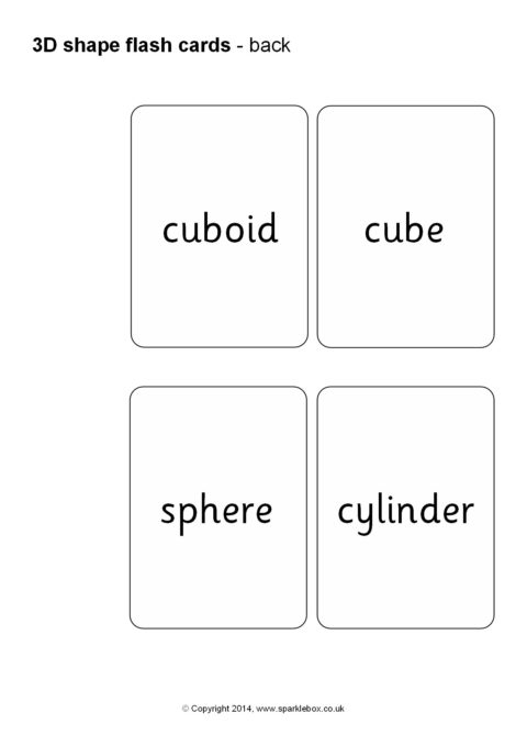 A set of double-sided printable flash cards (4-to-a-page) showing common 3D shapes. The shape names can be printed on the reverse of each card.